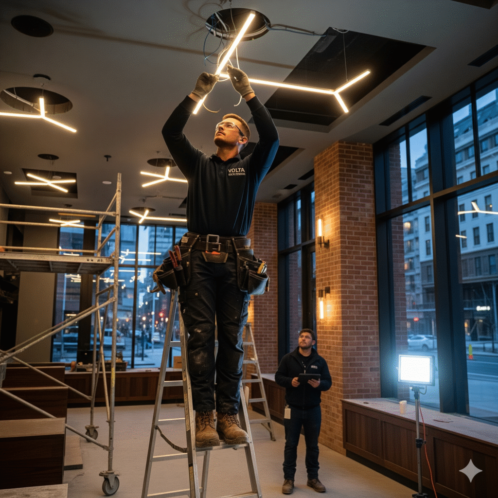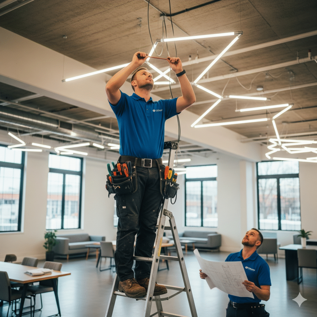 - We handle all types of commercial electrical projects. Our services include the installation and maintenance of office lighting, new fixtures, complete wiring and wire replacements, outlets, dimmers, panel changes, and routine maintenance. Our skilled teams are proficient in all lighting installations and upgrades, as well as specialized electrical wiring for a variety of businesses like restaurants, manufacturing plants, and public centers. We also install custom lighting, including pot lights, chandeliers, dimmers, LED lighting, and other energy-saving solutions.