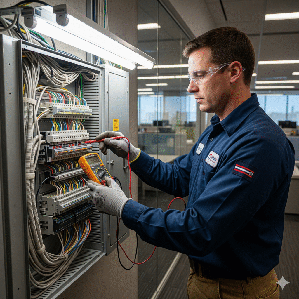 - Regular electrical maintenance is key to preventing problems before they start. We provide scheduled tune-ups, proactive problem-solving, and safety inspections. Our services include routine checks for illuminated signs, LED lighting, and critical safety devices such as smoke and carbon monoxide detectors. Our electricians are well-versed in commercial building safety codes and can address any electrical issues during a scheduled visit. We offer flexible scheduling, including before- and after-hours maintenance, to minimize disruption to your business.